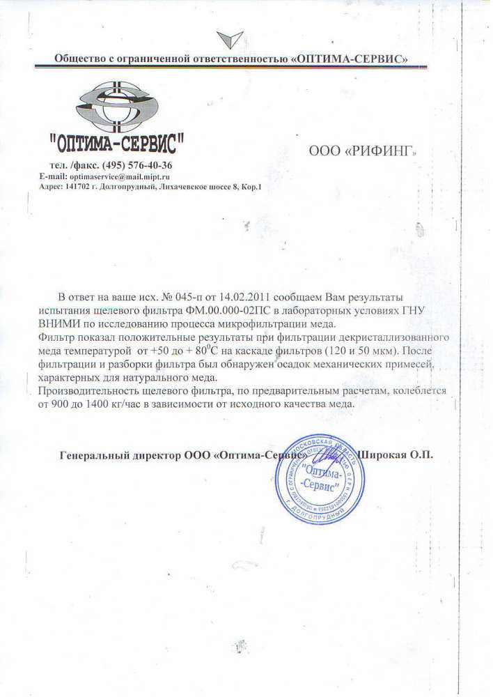 …результаты испытания щелевого фильтра ФМ.ОО.000-02ПС в лабораторных условиях ГНУ ВНИМИ по исследованию процесса микрофильтрации меда. ФИЛЬТР показал положительные результаты при фильтрации декристаллизованного мёда температурой от +50 до + 80°С на каскаде фильтров (120 и 50 мкм). Производительность щелевого фильтра, по предварительным расчетам, колеблется от 900 до 1400 кг/час в зависимости от исходного качества меда… |